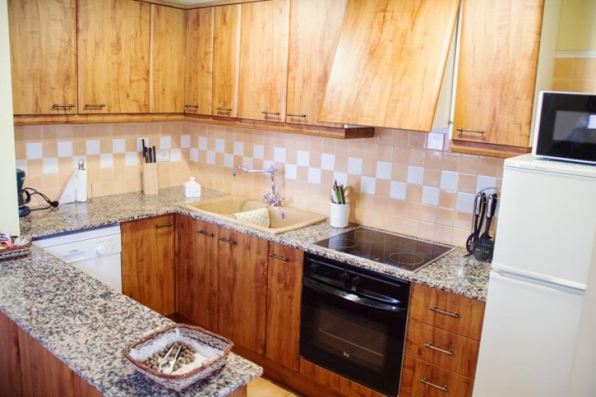 La cocina está totalmente equipada y tiene complementos de todo tipo; lavavajillas, microondas, vitroceramica, horno, cafetera y cubiertos.